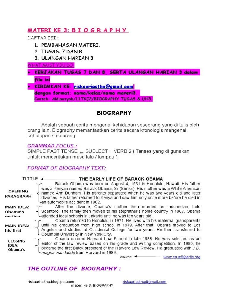 Di dalam bahasa inggris sendiri, biografi atau biography masuk kedalam writing skill atau kemampuan menulis. Dalam bahasa inggris dan secara istilahnya, biography text is a detailed description or account of a person's life and written by someone . Nah, berikut ini admin akan memberikan contoh untuk sahabat kbi mengenai biografi seorag ayah dalam bahasa inggris, yuk simak . Mengutip bahasainggris.pro biografi adalah kisah atau keterangan kehidupan seseorang yang ditulis oleh orang lain. Untuk dapat terampil menulis tidak hanya biografi .
